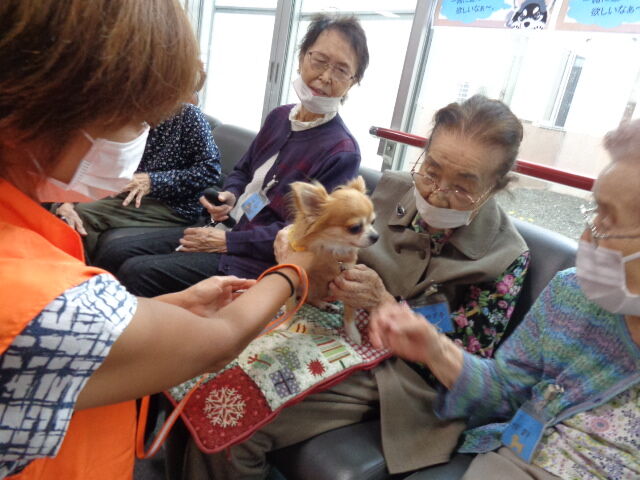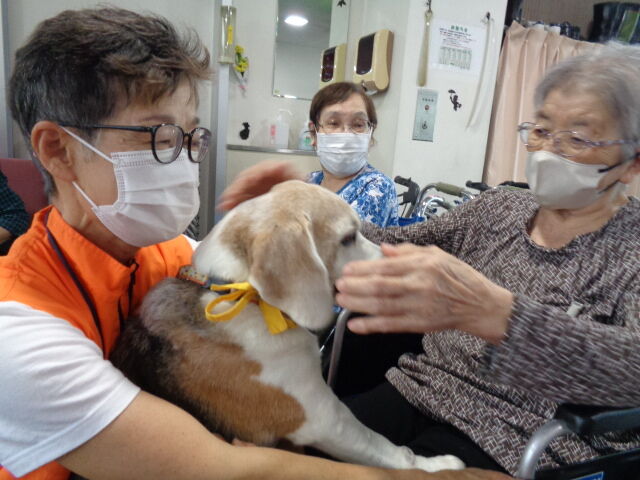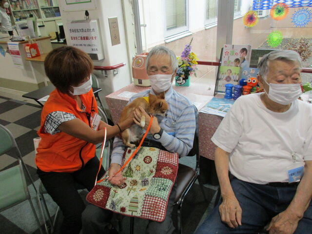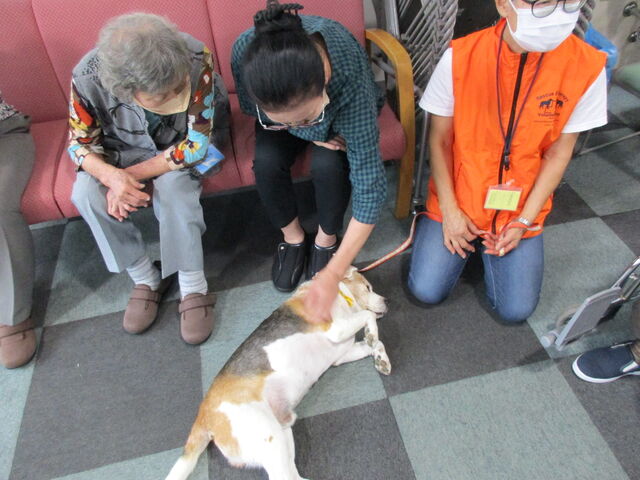 今回は3匹(ビーグル犬2匹、チワワ1匹)のワンちゃんに来てもらい、通所リハビリの利用者様に交流を図っていただきました
