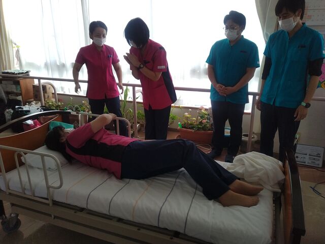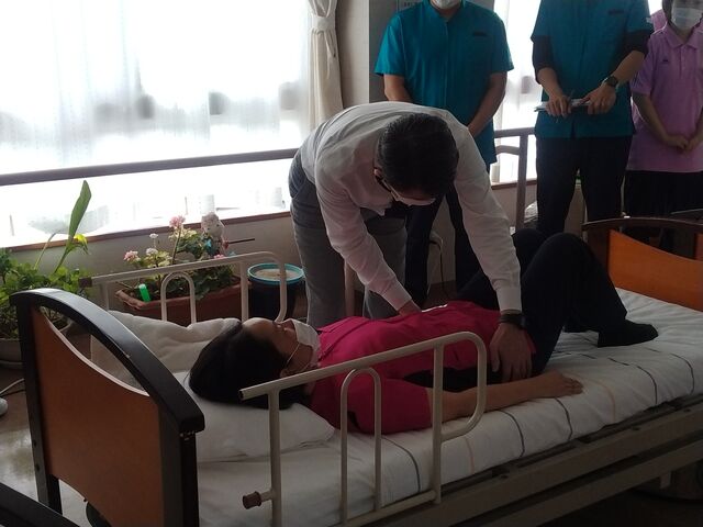 「動き出しは本人から」~当たり前のことを当たり前に実践するための考え方から実技まで~という研修テーマで講師の日本医療大学リハビリテーション学科教授大堀先生から講義と実技を踏まえてご教授頂きました。