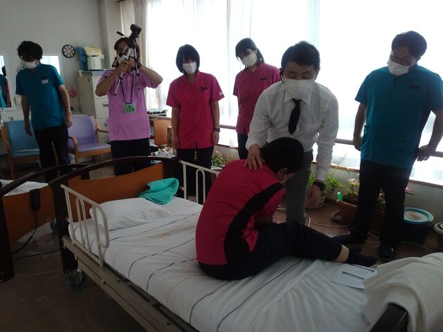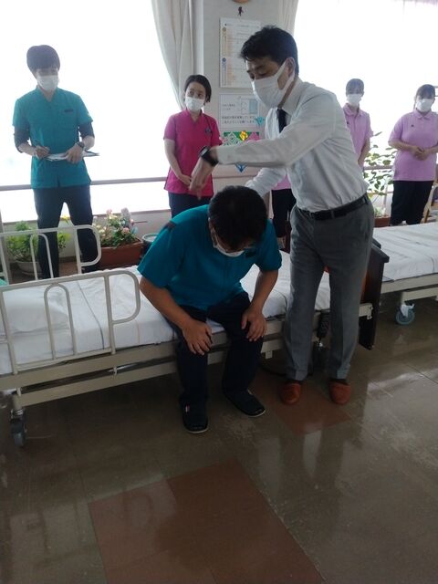 研修会はオンラインでしたが実技演習参加4施設のうちの1施設として、会場となった老健月形緑苑さんへお伺いさせていただきました。