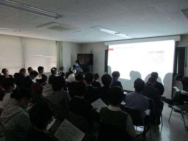 本日は、法人内のケアマネ(岩見沢居宅、ケアマネセンター北翔会、介護プランセンターほろむい、地域包括支援センターほろむい、南地区地域包括支援センター)やサービス事業所管理者など総勢約40名に対し、先月開設しました『北翔館訪問リハビリテーション』責任者が講師となり以下のような内容についてお話ししました。