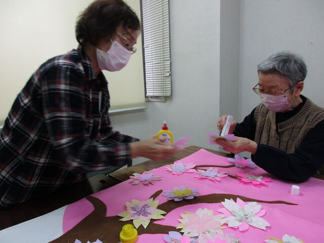皆さんで一枚ずつ丁寧に作成した桜の花びらを、職員が作成した桜の木の画用紙に貼っていきました