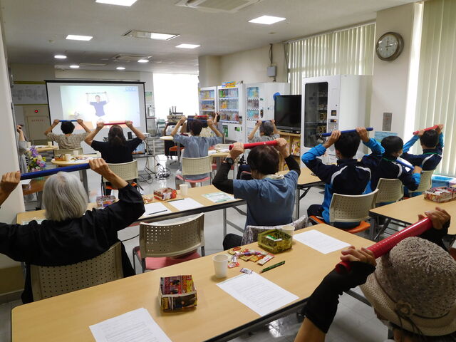 また、今回は市内の中学生5名が職場体験学習に来ていた為、映画鑑賞後に地域住民の皆さんと一緒に脳トレや体操等のアクティビティに参加してもらいました