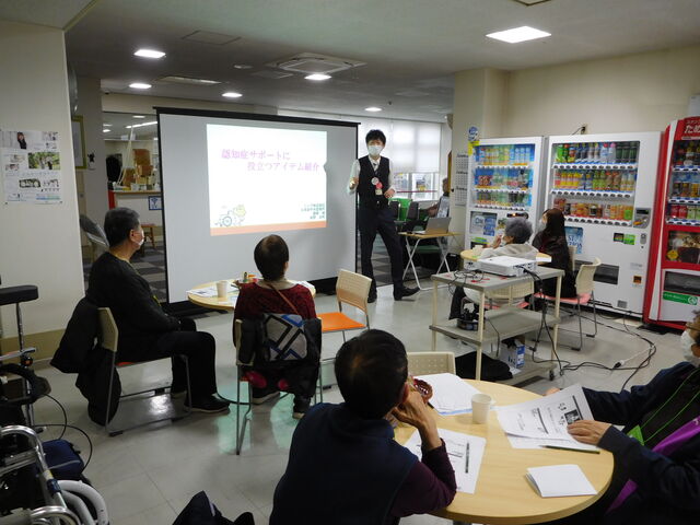今回は、外部講師として車いすの全国的メーカーであり、福祉用具等を幅広く取り扱っているニック株式会社の福祉用具専門相談員 藤原様より「認知症サポートに役立つアイテム紹介」というテーマでお話ししていただきました