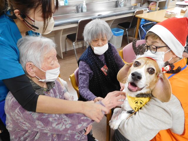 今回は5匹(トイプードル2匹、ビーグル1匹、チワワ1匹、ラブラドールレトリバー1匹)のワンちゃんに来てもらい、2階フロアのご利用者様と触れ合っていただきました