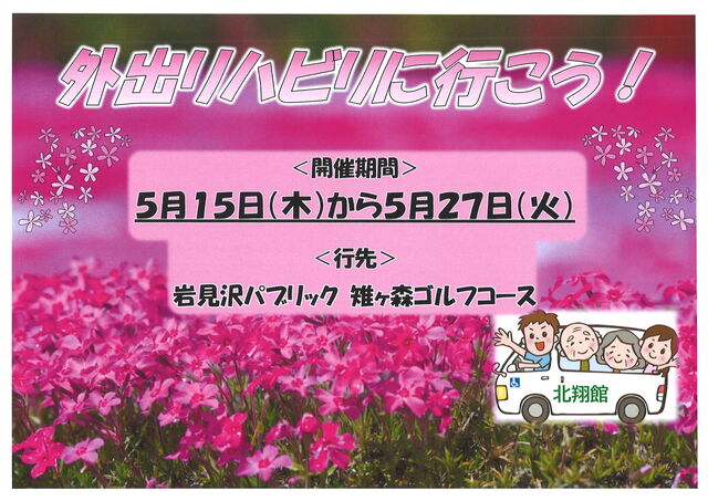 通所リハビリテーションでは5月15日から27日の期間で、岩見沢市内にある雉ヶ森ゴルフ場さんで新たな見所となっている芝桜見学を兼ねた外出リハビリツアーへ行ってまいりました