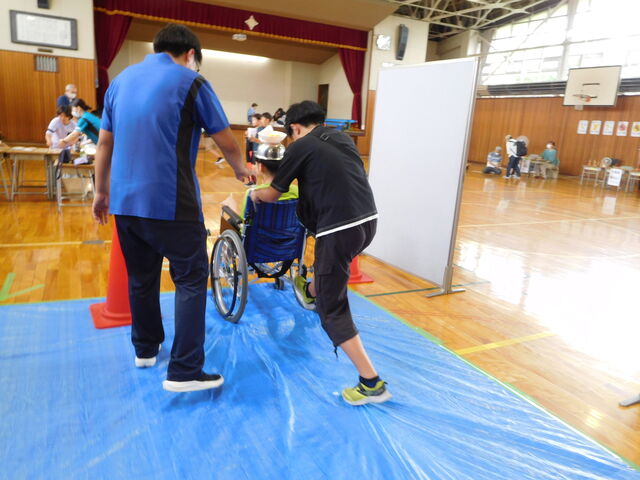 ゲーム感覚で楽しく車いす操作を体験してもらおうと、頭に乗せたピンポン玉を落とさないように様々な障害物をクリアしてゴールするルールとしました