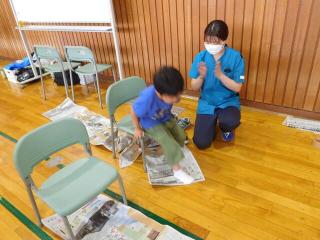 お友だち同士で座った状態で足を動かしどちらが早く新聞紙を回収できるかを競う足のリハビリテーション体験