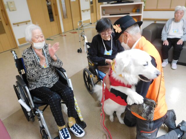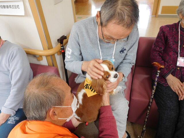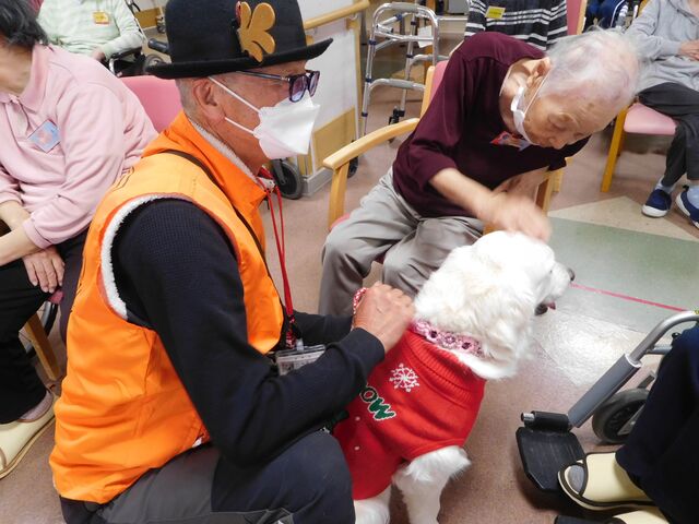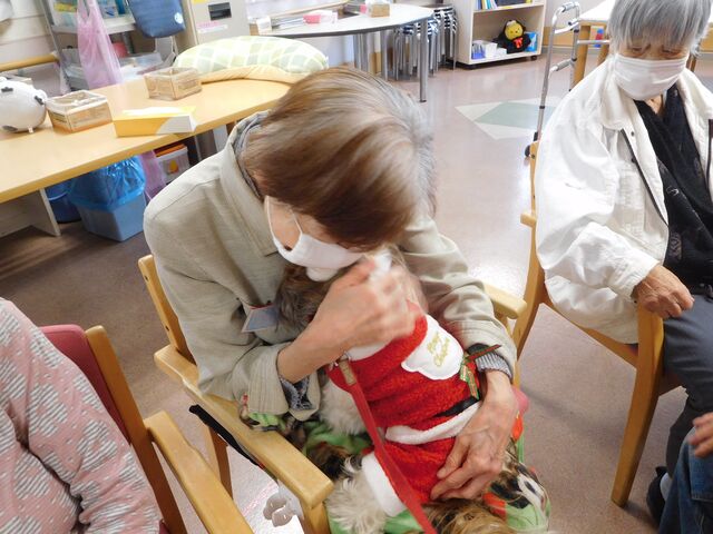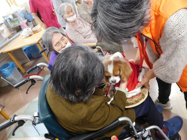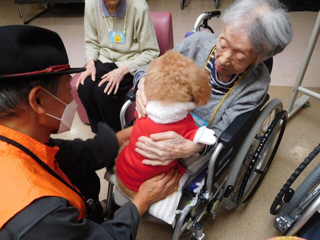 今回は5匹(トイプードル3匹、ゴールデンレトリーバー1匹、シーズー2匹)のワンちゃんに来てもらい、2階と2階東入所フロアのご利用者様と触れ合っていただきました